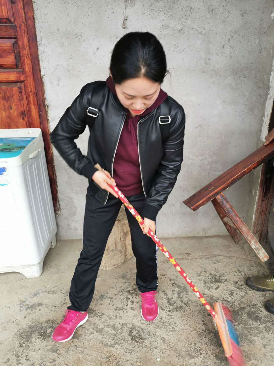 王德敏老师拿起扫帚认认真真的为卡户示范卫生打扫和如何保持。